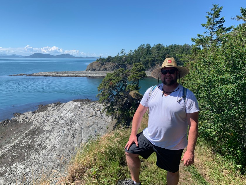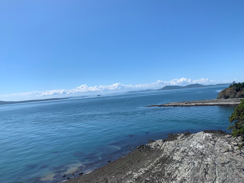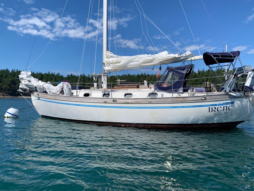 Weather finally cleared so we took off from Doe bay for Sucia Island. Did some day sailing. Not much progress against the tides, but still fun to get the sails up. We also made time to paint our stripe.